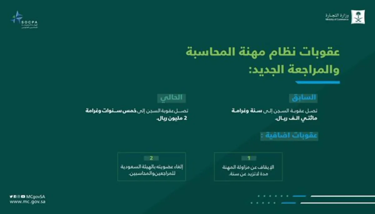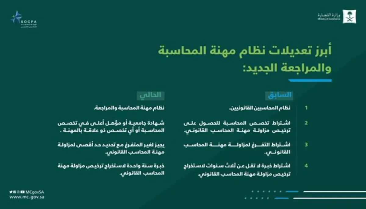 وأوضحت الهيئة أن النظام الجديد يواكب تطورات بيئة الأعمال في المملكة في ظل تنامي عدد الشركات، وارتفاع حجم الاستثمارات الأمر الذي يستدعي زيادة عدد المحاسبين القانونيين، وتنظيم مهن جديدة مرتبطة بمهنة المحاسبة والمراجعة لحاجة الشركات والمنشآت الصغيرة والمتوسطة لتلك المهن.