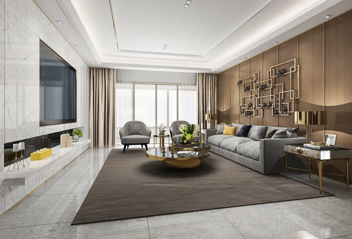• يُقسّم الجدار الأساسي في الصالون إلى ثلاثة أقسام: يُكسى الجزء في الوسط بالجبس بورد النافر عن الجدار، وخلفه إنارة مخفيَّة تمتدّ من الأرض إلى السقف، وتلفّ على وسط الأخير مما يوحي بشكل "إل" المُعاكس. يمكن تثبيت شاشة التلفاز على الجبس بورد وسط الجدار، وحوله تبدو الإنارة المخفيَّة. ويمكن أيضًا إعداد تصميم على جانبي السقف، عبارة عن "بوكس" ينخفض عنه، ويُدعّم بإنارة مخفيَّة.