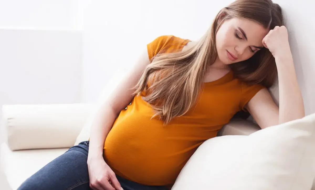 يظهر حجم البطن كبيراً، ويبرز بشكل واضح مما يؤدي لألم في الظهر حيث يضغط الجنين على العمود الفقري، كما أن الرحم يتوسع إلى أعلى ، ويزيح الأمعاء ويضغط على الحجاب الحاجز والرئتين والكبد، ونتيجة لذلك ، قد تشعر الحامل بإحساس خفيف بالاختناق وضيق التنفس، وهذا يؤدي لشعورها بالضيق، وينتهي الأمر بالولادة.