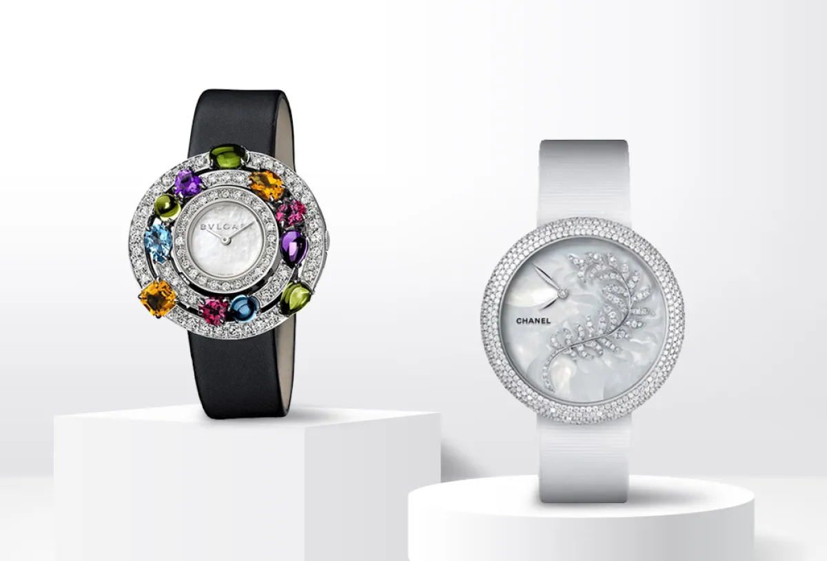 تُفضل الكثير من النساء المجوهرات والساعات المُرصعة بالأحجار الكريمة، وإذا كنت تبحثين عن ساعة فاخرة بمينا لؤلؤ مُصممة من الأحجار الكريمة لتكون هدية يوم الأم، يُمكنك الاستعانة بهذه الساعة الفخمة من ماركة بولغاري Bvlgari، وهي ساعة مُصممة من مينا لؤلؤ صغير تحتضنها علبة من الذهب الأبيض عيار 18 قيراطاً، مُصممة من ثلاث دوائر مُرصعة بالألماس والأحجار الكريمة الملونة.