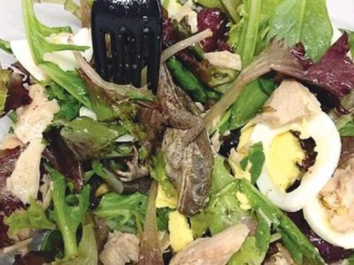 صعقت أميركية عند اكتشاف ضفدع نافق في وجبة سلطة، طلبتها من أحد المطاعم في نيويورك، الذي بدأ تحقيقا لتحديد سبب ما حصل.