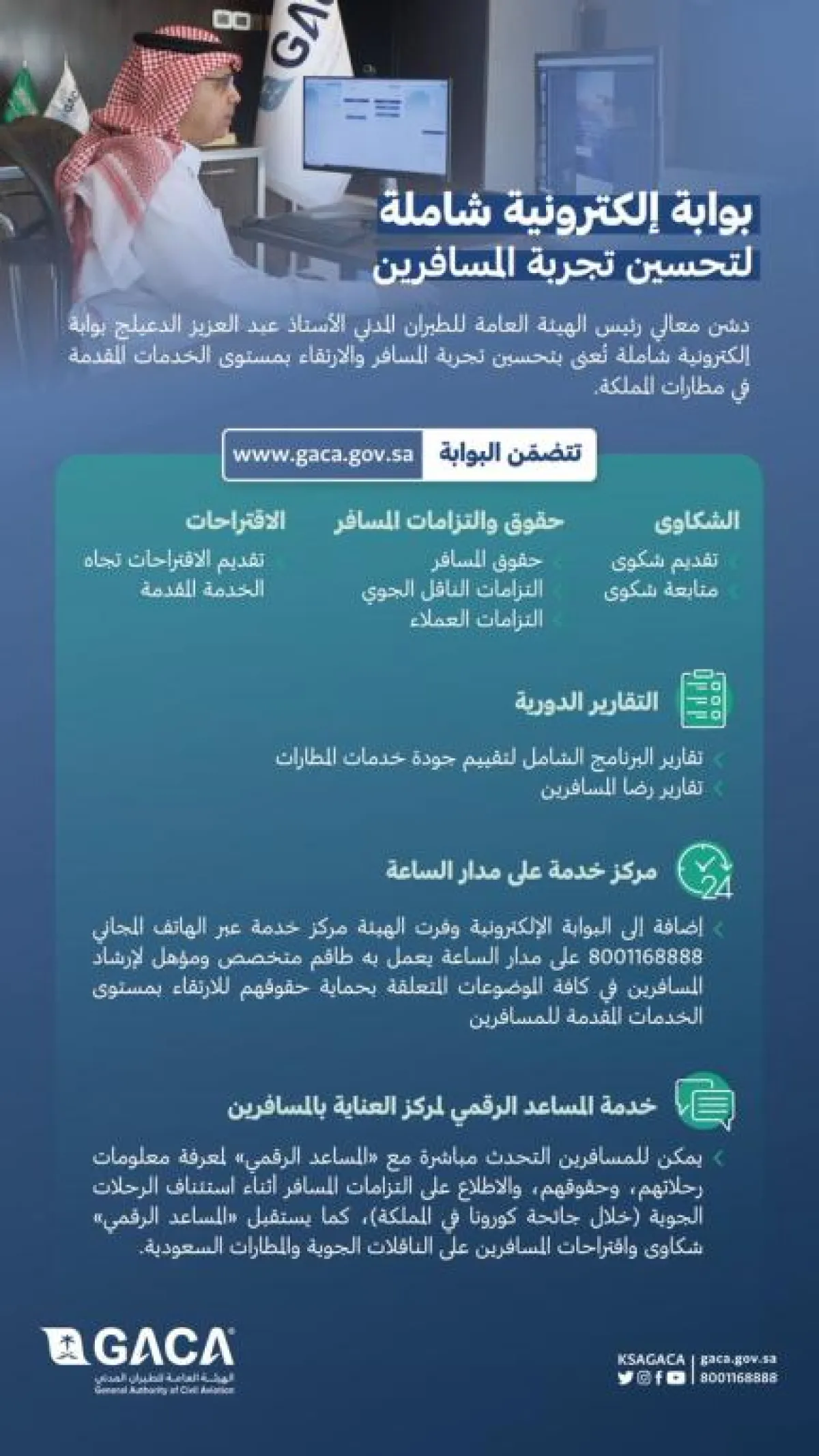 وتّمكّن البوابة المسافرين من التحدث مباشرة مع "المساعد الرقمي "لمعرفة معلومات رحلاتهم وحقوقهم، والاطلاع على التزامات المسافر أثناء استئناف الرحلات الجوية (خلال جائحة كورونا في المملكة).