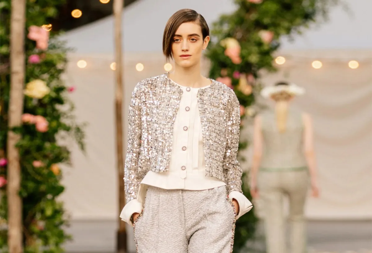 ولإطلالة عصرية بالبدلة المُصممة بالألوان الترابية، يُمكنكِ الاستعانة بهذا التصميم الجذاب من ماركة شانيل Chanel لبدلة باللون الأخضر المائل للرمادي Grey Green، مُصممة من فيست ذي رقبة على شكل حرف V، مع جيوب على الصدر وجانبي الخصر مُطرزة بالخيوط ذات اللون الأخضر، إضافة إلى3 أزرار أمامية باللون البيج.