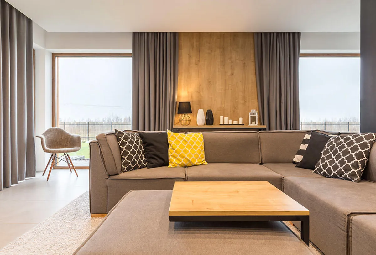 • في المنزل المودرن، يمكن انتقاء كل وسادة بلون، إذا كانت الأريكة رمادية، مع التنسيق مع الستائر أو السجادة أو المقعد المنفرد.