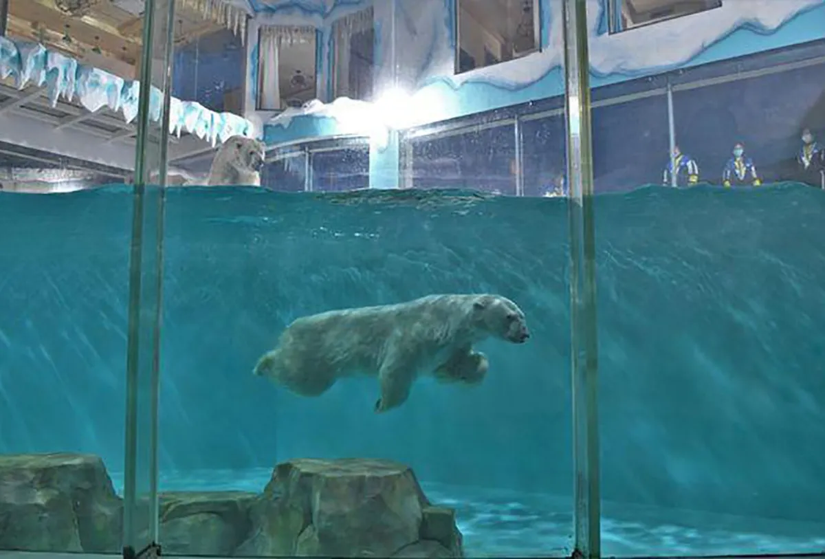 في عام 2016، اجتذب مركز تسوق في مدينة قوانجتشو بجنوب الصين إدانة عالمية بعد ظهور مقاطع فيديو دب قطبي يُطلق عليه اسم «بيتزا»، يطلق عليها اسم أتعس دب قطبي في العالم يرقد على جانبها في سياج بجدار زجاجى. لكن تم نقلها لاحقًا إلى حوض للماء والتقت بوالدتها.