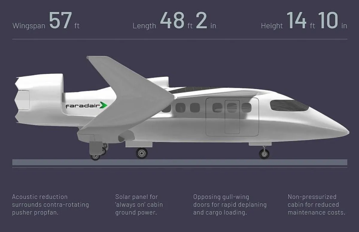 صممت شركة بريطانية طائرة هجينة تعمل بالطاقة الكهربائية، وتهدف إلى أن تكون جاهزة للرحلات التجارية بحلول عام 2026، وأن يكون لديها أسطول كامل متاح بحلول نهاية العقد. وبحسب موقع «ديلي ميل» تعمل شركة فاردير على طائرتها الكهربائية الحيوية «الباحة -Beha» التي ستكون قادرة على الوصول إلى سرعات تبلغ نحو 230 ميلاً في الساعة.