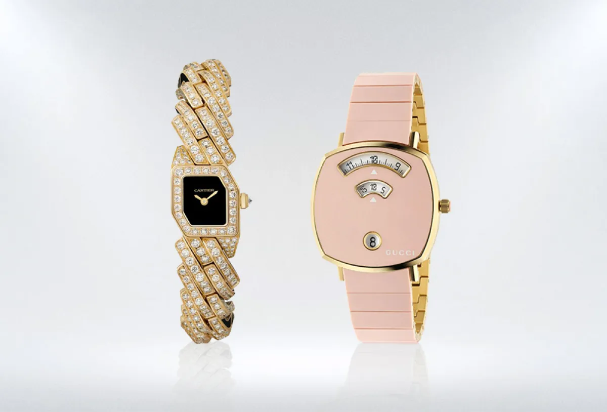 من مجموعة علامة كارتييه «Cartier» اخترنا لكُنَّ ساعة من مجموعة «مايون دو كارتييه»، تعمل بآلية حركة الكوارتز، وصُممت علبة الساعة والتاج والسوار من الذهب الأصفر عيار 18 قيراطاً، ورُصِّعت بـ581 ماسة مزينة بقطع البريانت الحديث، مع العقارب المصمّمة على شكل سيف من الفولاذ المطلي باللون الذهبي، وميناء من طلاء اللّكر الأسود.