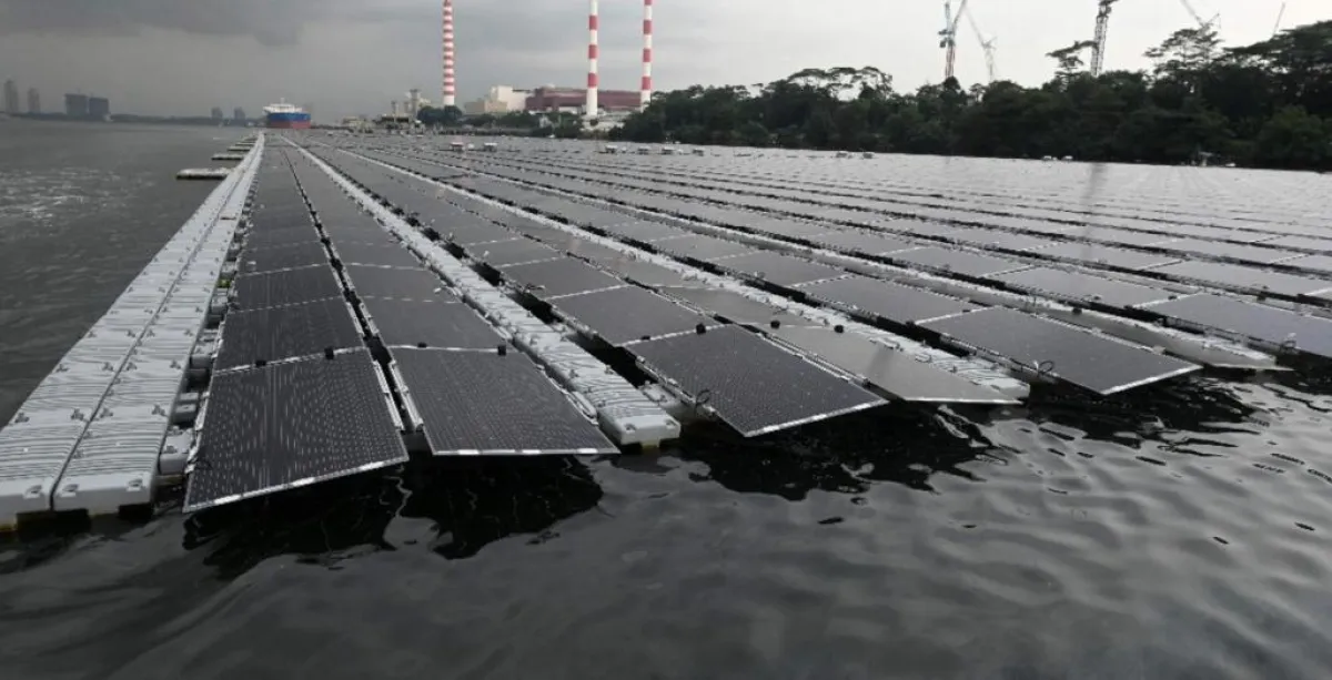 تمتد آلاف الألواح المتلألئة تحت أشعة الشمس في البحر قبالة سنغافورة، وهي جزء من مساعي الدولة المدينة الشحيحة الأراضي لبناء مزارع شمسية عائمة لخفض انبعاثات غازات الاحتباس الحراري.