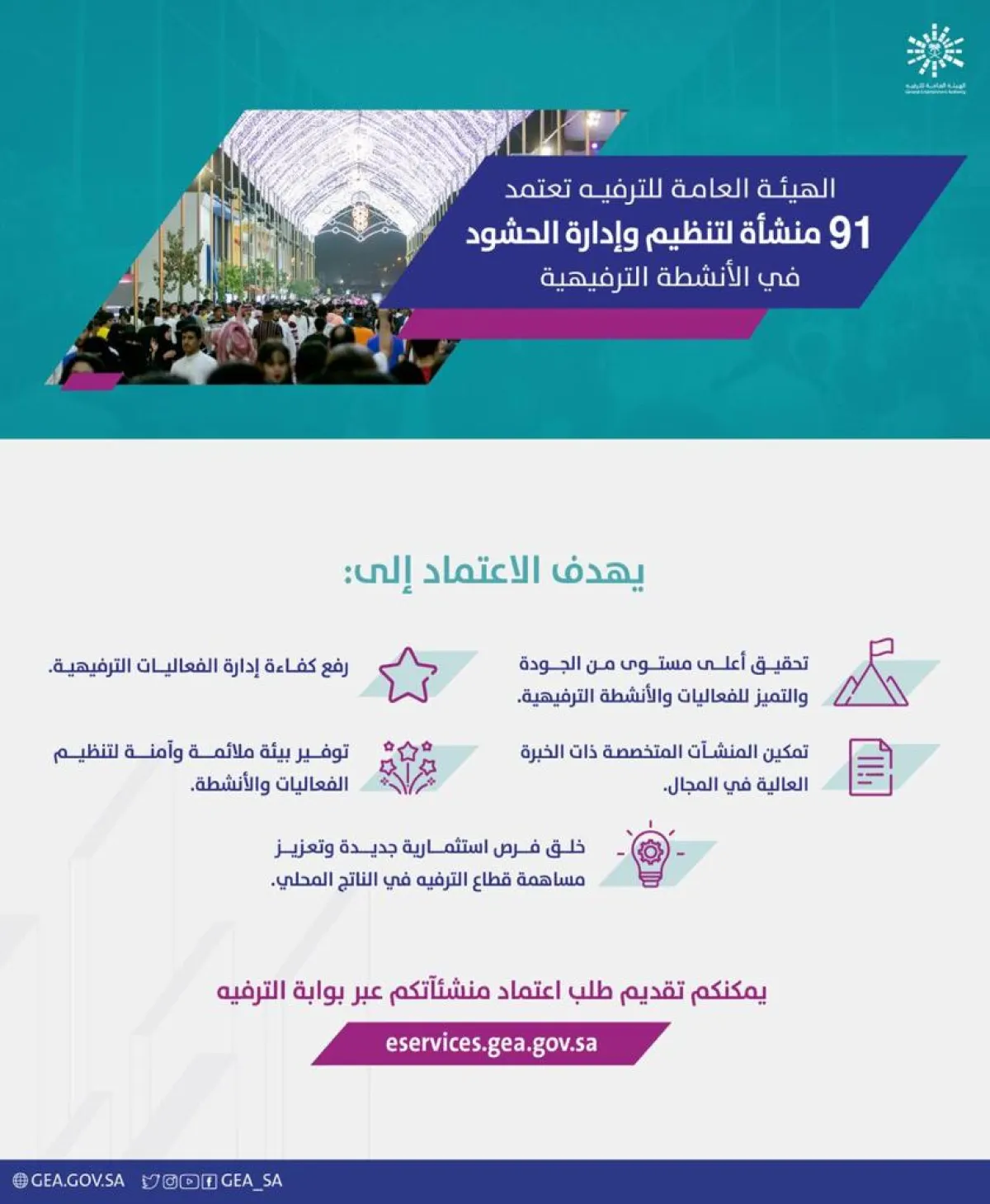 أصدرت الهيئة العامة للترفيه 91 شهادة اعتماد للمنشآت المتخصصة في تنظيم وإدارة الحشود في الأنشطة الترفيهية، وذلك بعد التأكد من استيفائها الشروط التنظيمية والقانونية التي وضعتها الهيئة، والتحقق من مدى كفاءتها المهنية وقدرتها الفنية على إدارة الحشود خلال الأنشطة الترفيهية.
