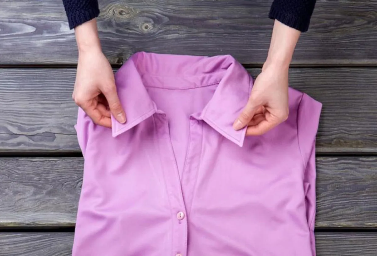 • يُفرد القميص على الطاولة، مع التأكد من أن الياقة متجهة للأعلى. وتوضع منشفة أسفل القميص لمنع أي منظف من التواجد على الطاولة.