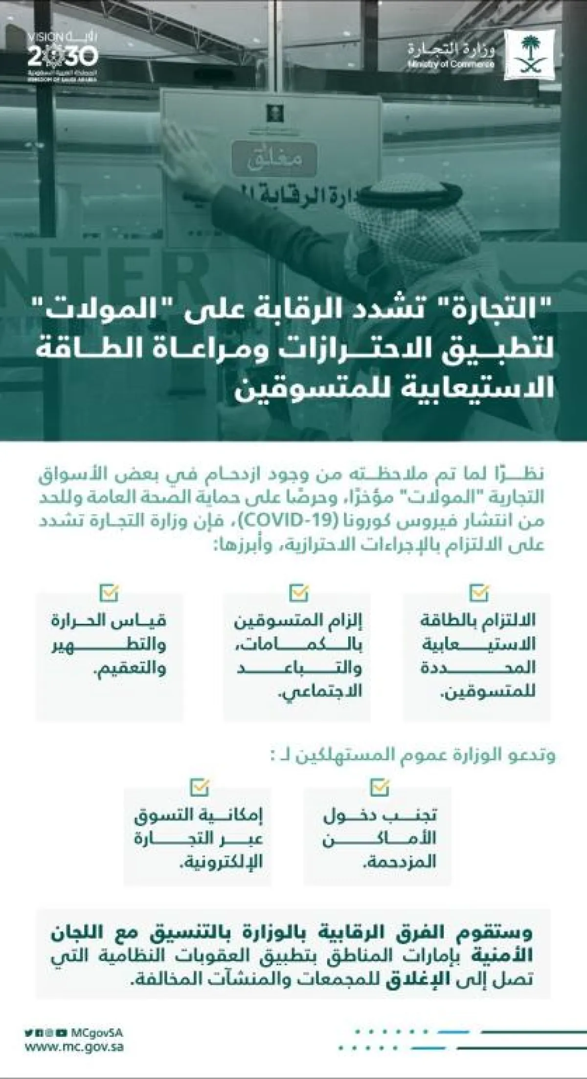 وأوضحت أن الفرق الرقابية بوزارة التجارة ستطبق العقوبات النظامية وإغلاق "المولات" غير الملتزمة فوراً، داعية المستهلكين لتجنب دخول المنشآت المزدحمة، والتسوق عبر المتاجر الإلكترونية.