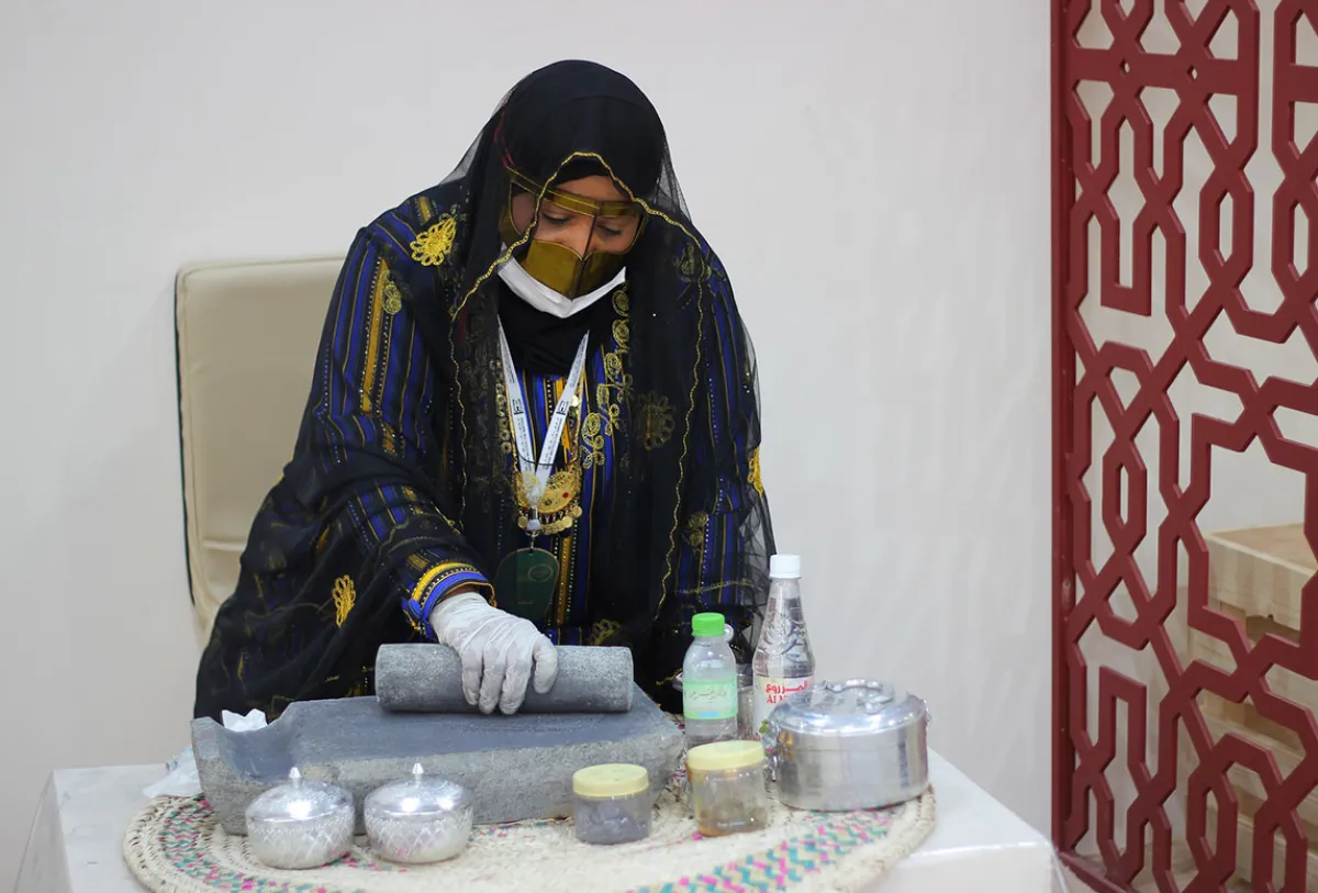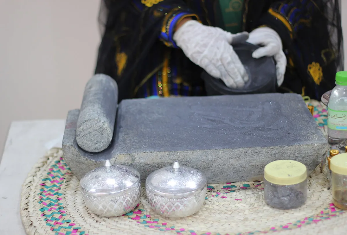من بين تلك السيدات يبدو لافتاً ما تقوم به تلك السيدة التي تحمل في يدها حجراً أسطواني الشكل، يتضح أنه ثقيل من حركته على قطعة مسطحة من الحجر ذاته، إذ تدحرج الحجر وتمرره على قطعة تبدو مثل صخور سوداء، وتحاول جاهدة أن تسحنها وتحولها إلى مسحوق ناعم كالطحين. يكفي الوقوف إلى جانبها، والاستماع لما ترويه لزوّار جناحها من الكبار والصغار، إذ تقول، وهي تشير بحركة إصبعها على امتداد عينها: "هكذا كنا نصنع الأثمد (الكحل)، وهذه الحجارة تصمم بشكل خاص لطحنه"، ولكن هذه الإجابة تثير مزيداً من الأسئلة: فما الذي تطحنه بالأصل؟