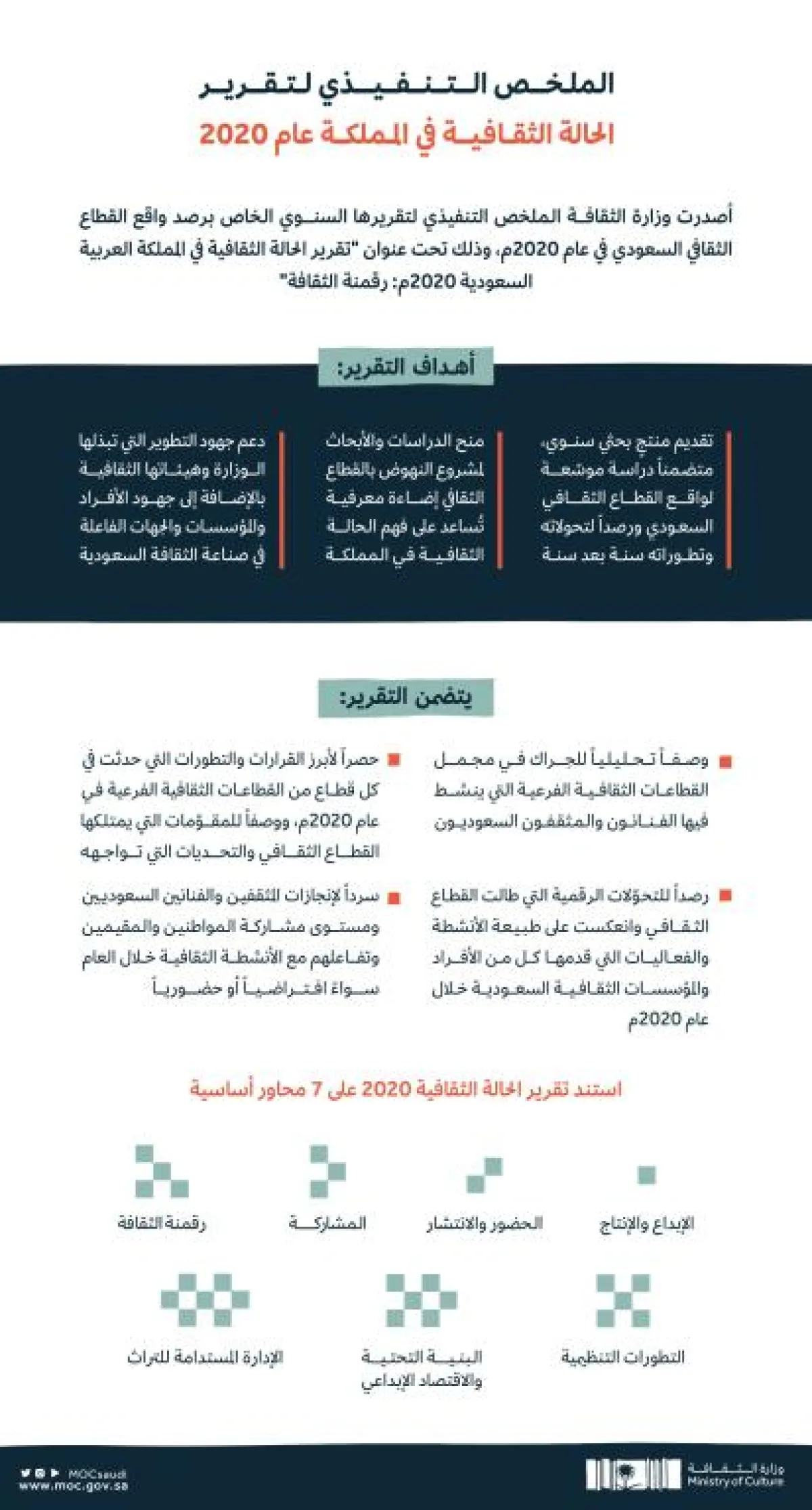 نشرت وزارة الثقافة عبر حسابها الرسمي على موقع التدوينات المصغر "تويتر"، انفوغراف، كشفت من خلاله عن أهداف الملخص التنفيذي لتقرير الحالة الثقافية بالمملكة عام 2020، والذي أصدرته مؤخراً تحت عنوان "تقرير الحالة الثقافية في المملكة العربية السعودية 2020م: رقمنة الثقافة".