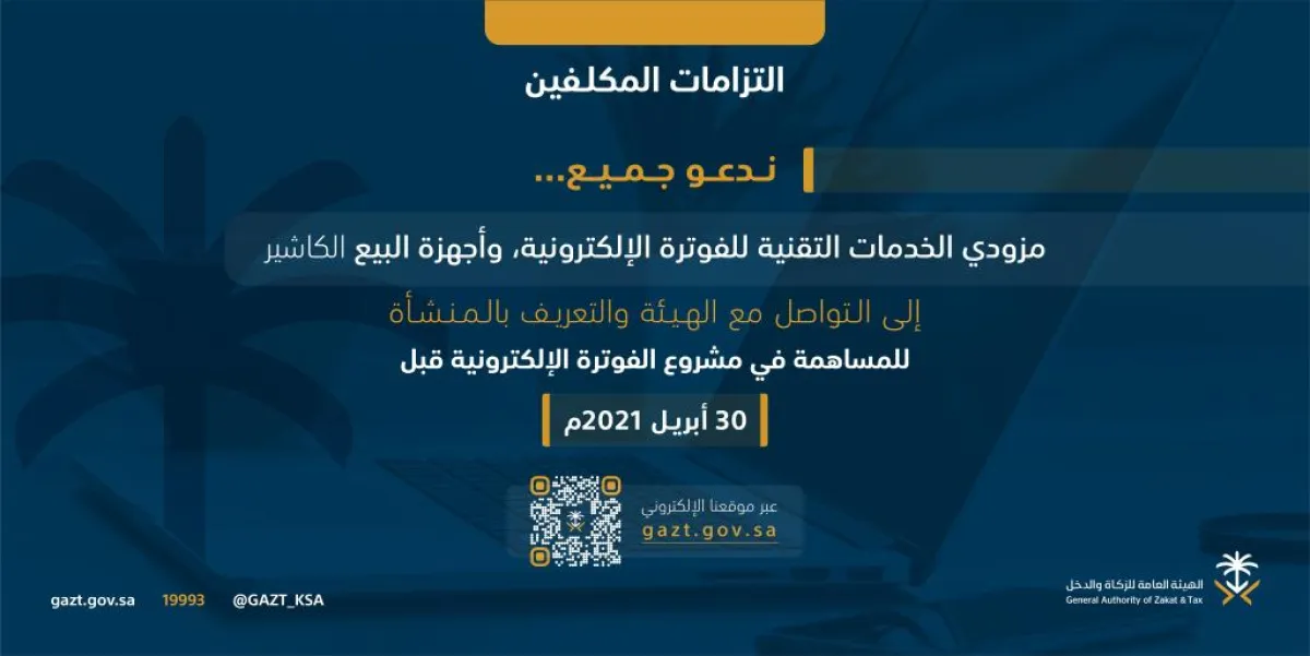 وأكدت الهيئة العمة للزكاة والدخل، على أن هذه الخطوة تأتي للإسهام في إنجاح مشروع الفوترة الإلكترونية، الذي تم الإعلان عن دخوله حيز التنفيذ في الرابع من ديسمبر من عام 2020م، وسيبدأ المكلفون بالعمل به إلزامياً ابتداءً من تاريخ الرابع من ديسمبر من العام الجاري.