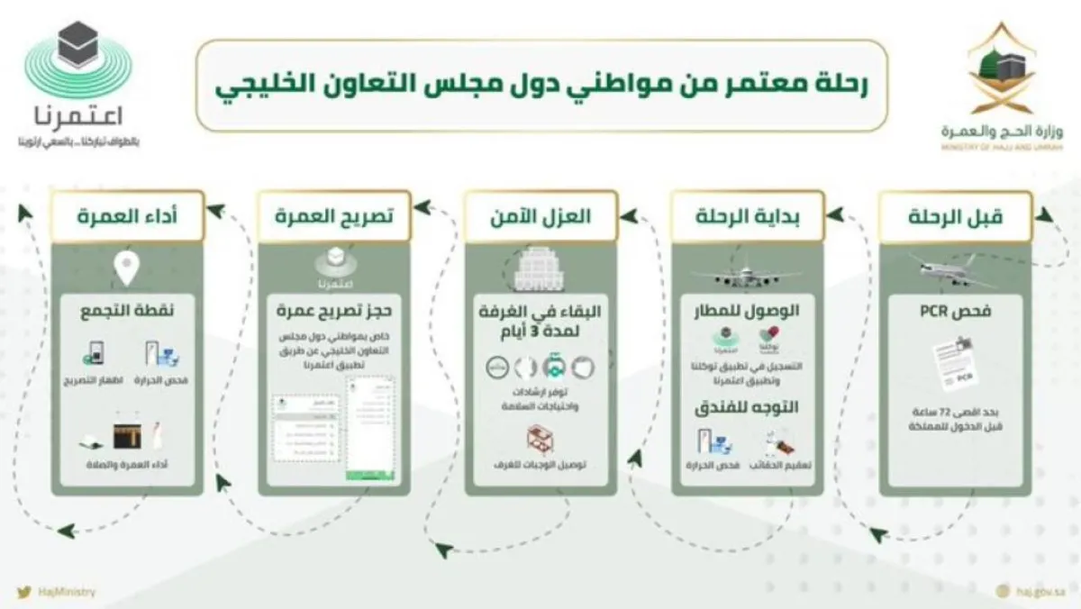 وحددت الوزارة خطوات رحلة المعتمر من مواطني دول مجلس التعاون الخليجي على النحو التالي: