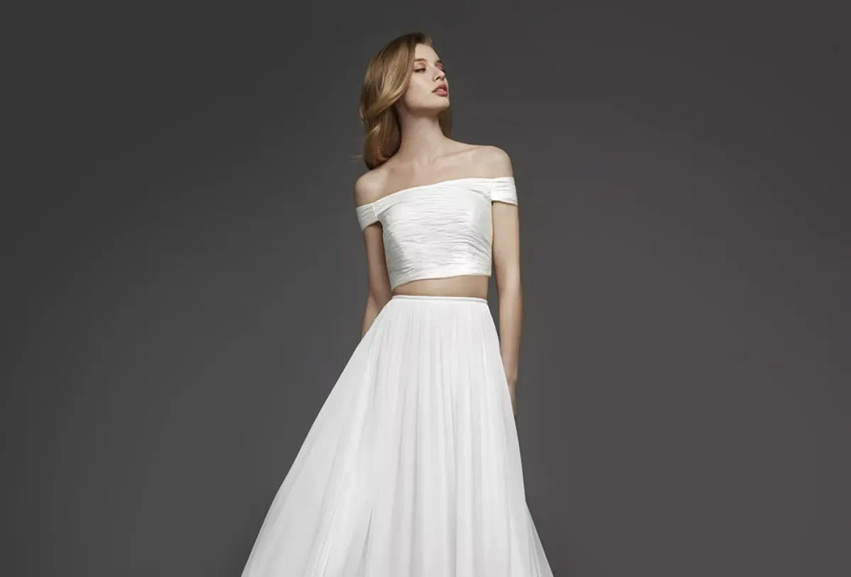 تقلّب العروس صفحات العديد من تصاميم الأزياء لفساتين الزفاف، ولكنها تتوقف جيداً عند الفساتين التي تتألف من قطعتين. هذا اللوك يليق بالفتاة العصرية والجريئة التي تبحث عن لوك مختلف عن باقي الفتيات. كما أن ذلك الفستان هو مرح وعصريّ، وسهل التنقل. كما يمكن الاستفادة من القطعتين كل واحدة على حدا، وتنسيق قطع أخرى معها بستايل يمكن القول أنه يشبه الغجريات.