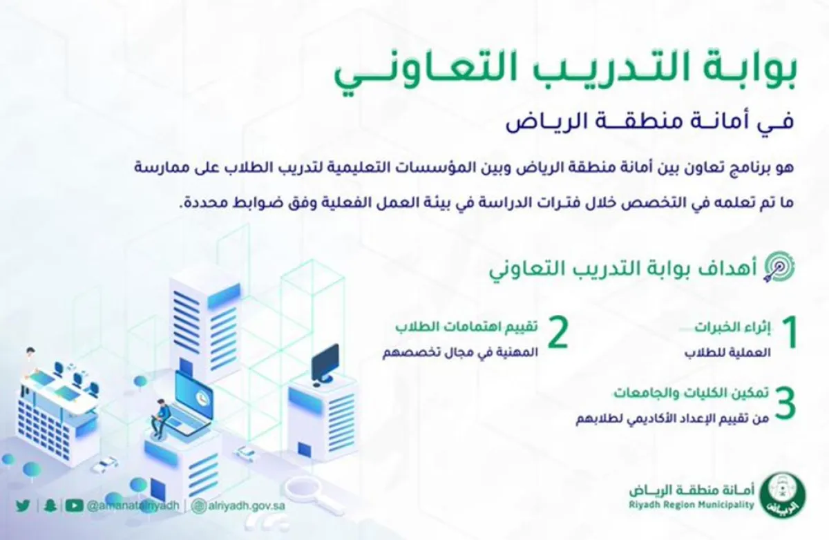 حيث دعت أمانة منطقة الرياض، أمس (الأربعاء)، طلاب وطالبات الجامعات والكليات إلى التسجيل عبر بوابة التدريب التعاوني، بهدف إكسابهم خبرات في بيئة العمل.