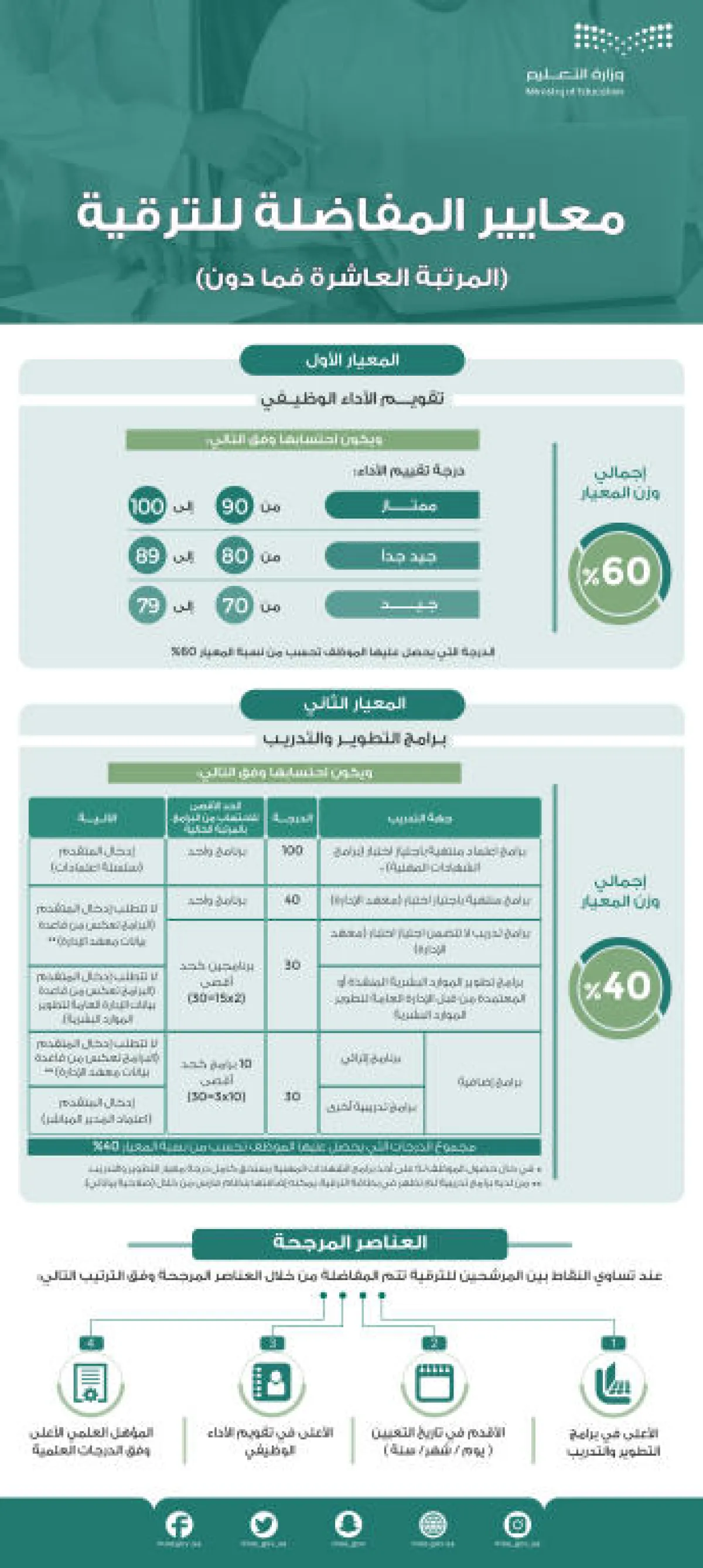 انطلاقاً من اهتمام وزارة التعليم بمنسوبيها من شاغلي الوظائف الإدارية، ولما تمثله الترقية من أهمية وأثر في تطوير الكوادر البشرية، واستمراراً لجهود الوزارة في ترقية منسوبيها كما أُعلن مؤخراً بتاريخ 28/ 6/ 1442 عن ترقية أكثر من 12 ألف موظف وموظفة في عملية ترقيات غير مسبوقة.