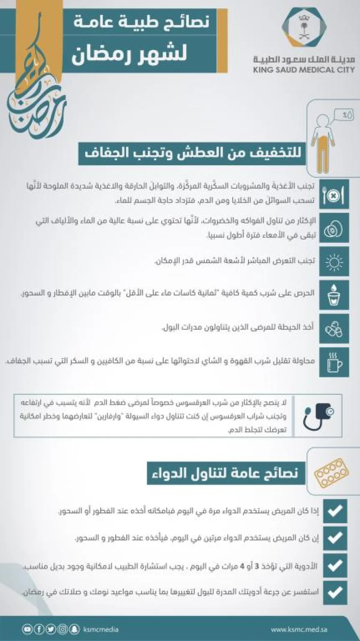 مدينة الملك سعود الطبية توجه نصائح طبية لشهر رمضان