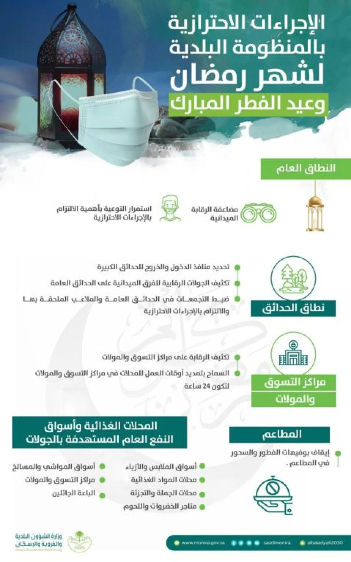 وكانت الوزارة قد قررت تعليق خدمة البوفيهات في المطاعم خلال شهر رمضان المبارك، وتكثيف الجولات الرقابية للفرق الميدانية للتأكد من الالتزام بالإجراءات الاحترازية وتطبيق البروتوكولات وضبط المخالفات في الحدائق العامة والملاعب غير المرخصة داخل النطاق العمراني، وأيضاً منع موائد الطعام في الأحياء، إضافة إلى السماح للمحال التجارية في مراكز التسوق والمولات بالعمل على مدى 24 ساعة لتقليل كثافة المتسوقين في أوقات الذروة.