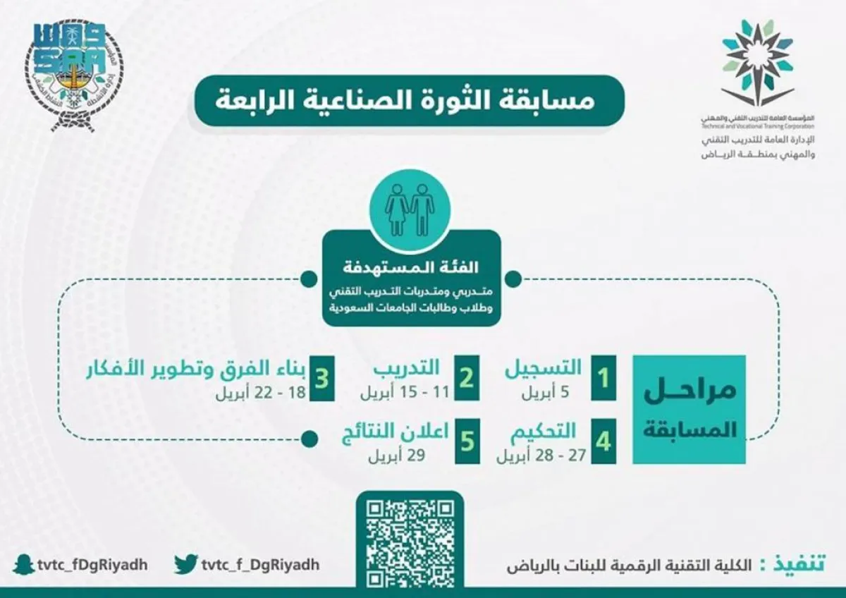 تنفذ الكلية التقنية الرقمية للبنات في الرياض مسابقة الثورة الصناعية الرابعة وذلك ضمن المخيم الكشفي الافتراضي وبرعاية مدير عام إدارة التدريب التقني والمهني بمنطقة الرياض الأستاذ عبدالرحمن بن عمر المقبل، خلال الفترة من 5 إلى 29 أبريل من العام الجاري.