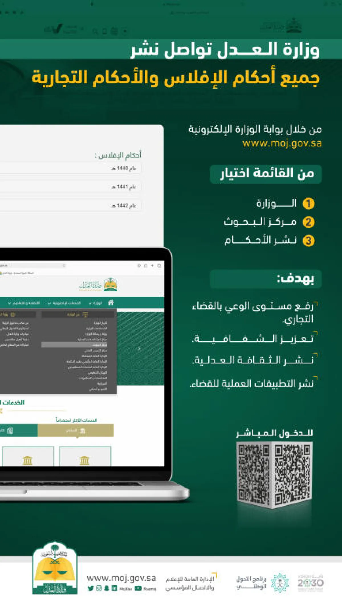 تعزيزًا للشفافية ونشر الثقافة العدلية أتاحت وزارة العدل الاطلاع على جميع الأحكام المتعلقة بقضايا الإفلاس، بالإضافة إلى نشر جميع الأحكام التجارية، وذلك عبر بوابة الوزارة الإلكترونية www.moj.gov.sa.