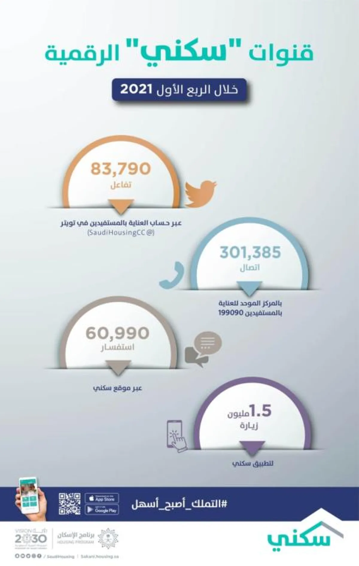 وتجاوز عدد مرات التفاعل عبر حساب العناية بالمستفيدين على منصة "تويتر" (SaudiHousingCC@) خلال الربع الماضي 83.790 تفاعل بمعدل ألف تفاعل يومي، ويُقدم الحساب الإجابة عن جميع استفسارات وتساؤلات المواطنين حول الخيارات والحلول السكنية التي يقدمها "سكني" من قروض مدعومة لشراء وحدات سكنية جاهزة وتحت الإنشاء والبناء الذاتي والأراضي السكنية، وذلك ضمن جهود البرنامج لتقديم خدمات وحلول تسهل تملك المنزل الأول للأسر السعودية.