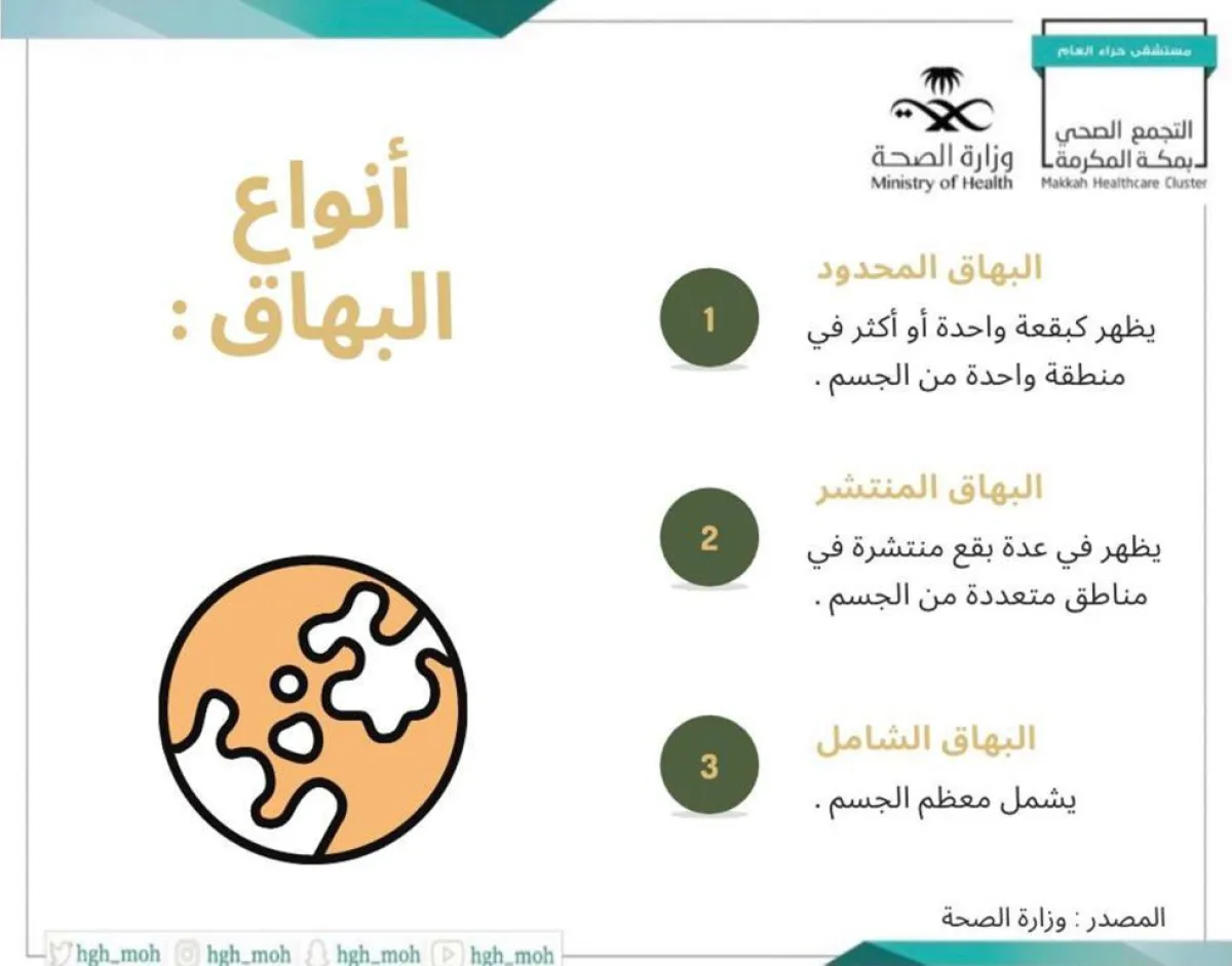 وفي هذا الصدد نشرت وزارة الصحة عبر حسابها الرسمي على موقع التدوينات المصغر "تويتر"، انفوغراف، كشفت من خلاله عن أنواع مرض "البهاق" الذي يصيب الجلد، ويحدث بسبب موت أو توقف عمل الخلايا الصبغية التي تنتج الميلانين.