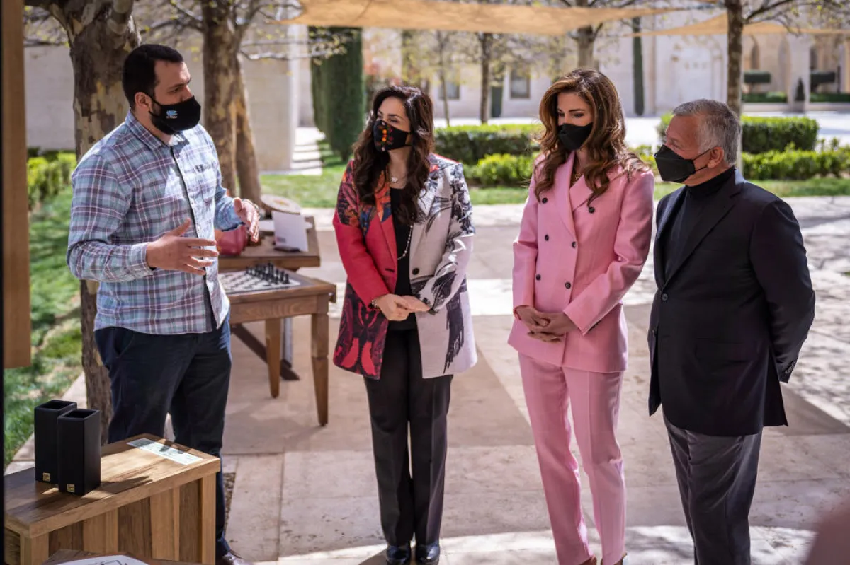 واطلع الملك أمس الثلاثاء، ترافقه الملكة رانيا العبدالله، على منتجات عدد من الشباب والشابات أصحاب المشاريع الحرفية الصغيرة في مختلف المحافظات، بعد تلقيهم التدريب اللازم، من خلال مبادرة "شباب منتج" التي أطلقها الديوان الملكي الهاشمي عام 2019 بتوجيهات ملكية، بناء على لقاءات جلالته مع شباب من مختلف المحافظات، لمساعدتهم على تطوير منتجاتهم وأفكارهم الريادية وتحويل مواهبهم إلى مشاريع ناجحة، وفقًا لوكالة الأنباء الأردنية (بترا).