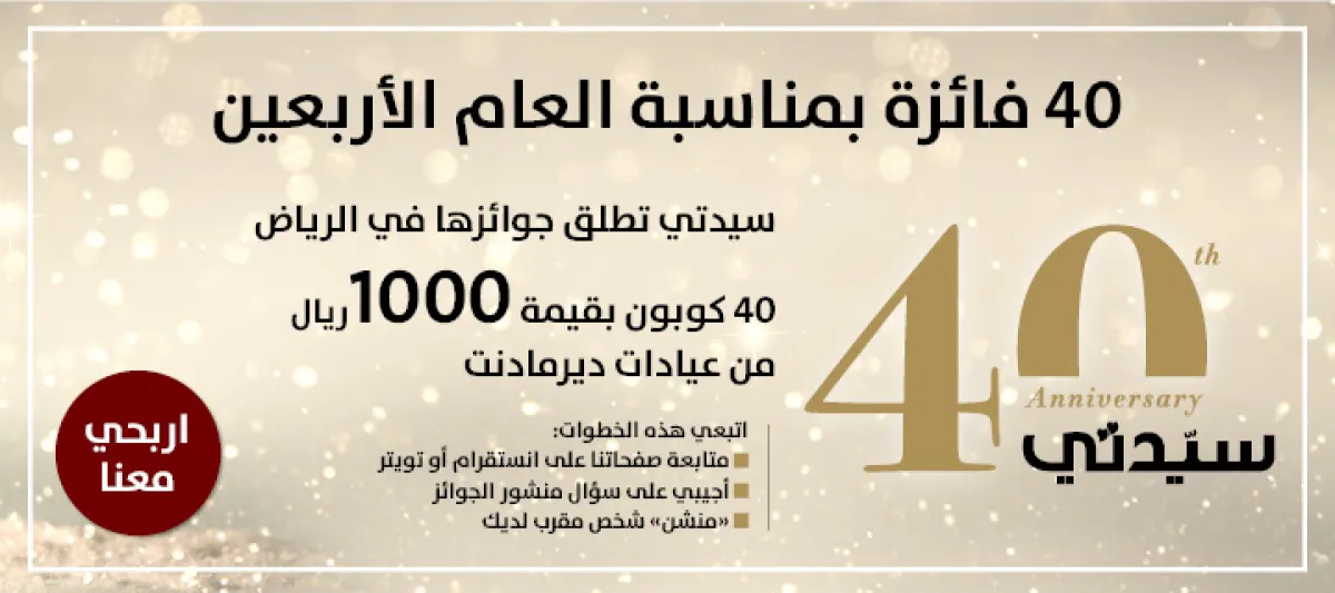 احتفلت سيدتي مع إطلاق عددها الإستنثائي 2085، بمرور 40 عاماً على ولادتها، مجددةً في إطلالاتها من ناحية طريقة وشكل طرح القضايا التي تتعلق بصلب حياة المرأة والأسرة الخليجية والعربية، لم تكتفِ سيدتي بهذا الحدّ، بل احتفلت أيضاً مع متابعاتها على منصتي "انستقرام" و"تويتر"، وذلك بتقديم 40 كوبون بالتعاون مع عيادات ديرمادنت في الرياض لخدمات الليزر، الجلدية والجراحة التجميلية، وقد تم الإعلان اليوم عن الفائزات الأربعين.