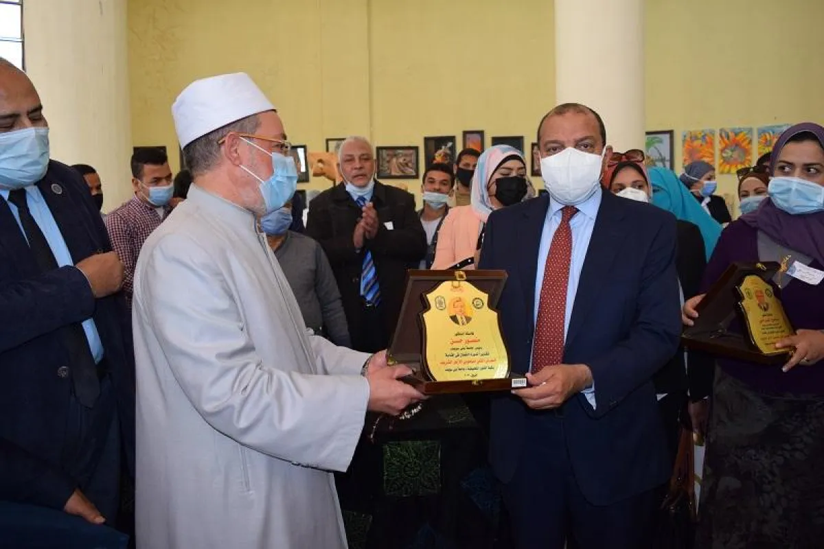 وقد قام الدكتور منصور حسن بإهداء درع الجامعة للشيخ سيد عبد اللطيف، كما أهدى فضيلته درع منطقة بني سويف الأزهرية لرئيس الجامعة، فيما قام الدكتور تامر عبد اللطيف عميد الكلية بتكريم المستشار هشام الرفاعي والدكتور محمد ماضي وكيل الكلية على مجهوداتهما المبذولة في سبيل إنجاح هذا المعرض.