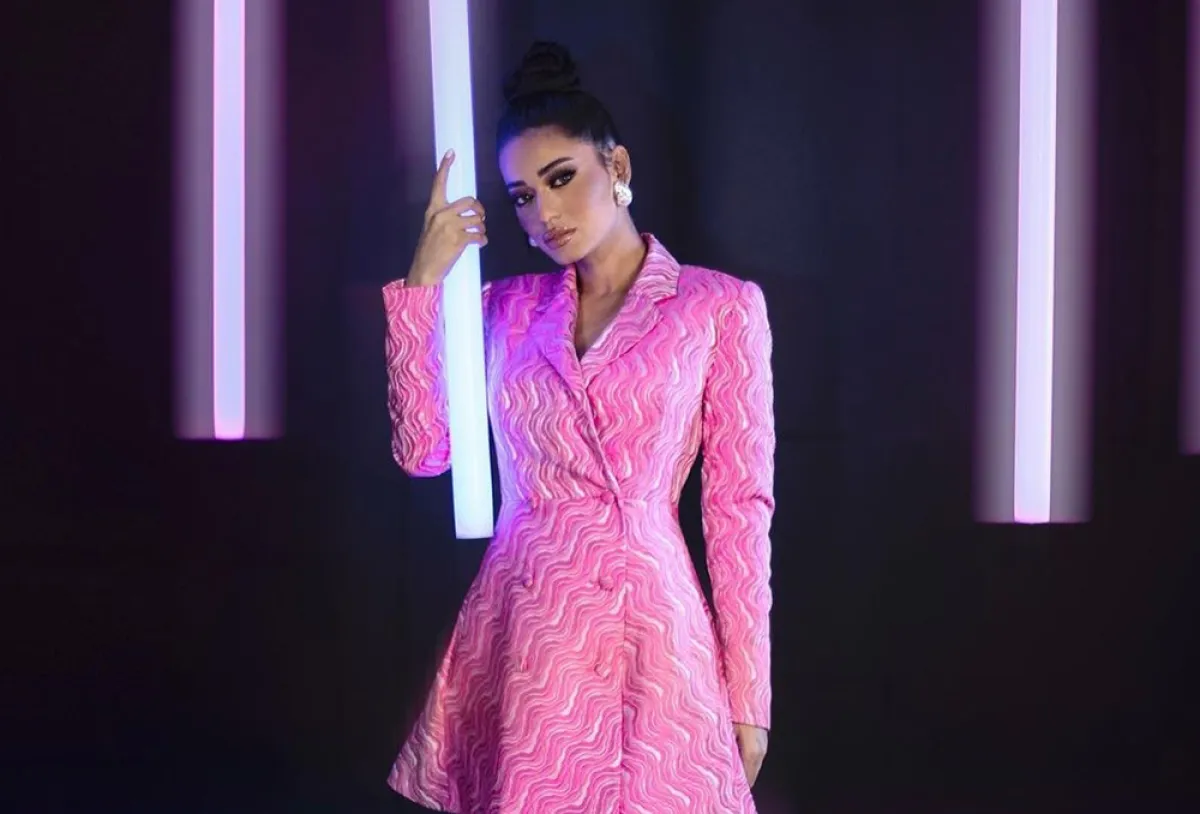 استوحت رحمة رياض من الأحجار الكريمة الوردية كالتورمالين هذا الفستان البليزر الذي تميز بأزرار مزدوجة ورفعت شعرها فبدت في قمة الأناقة.
