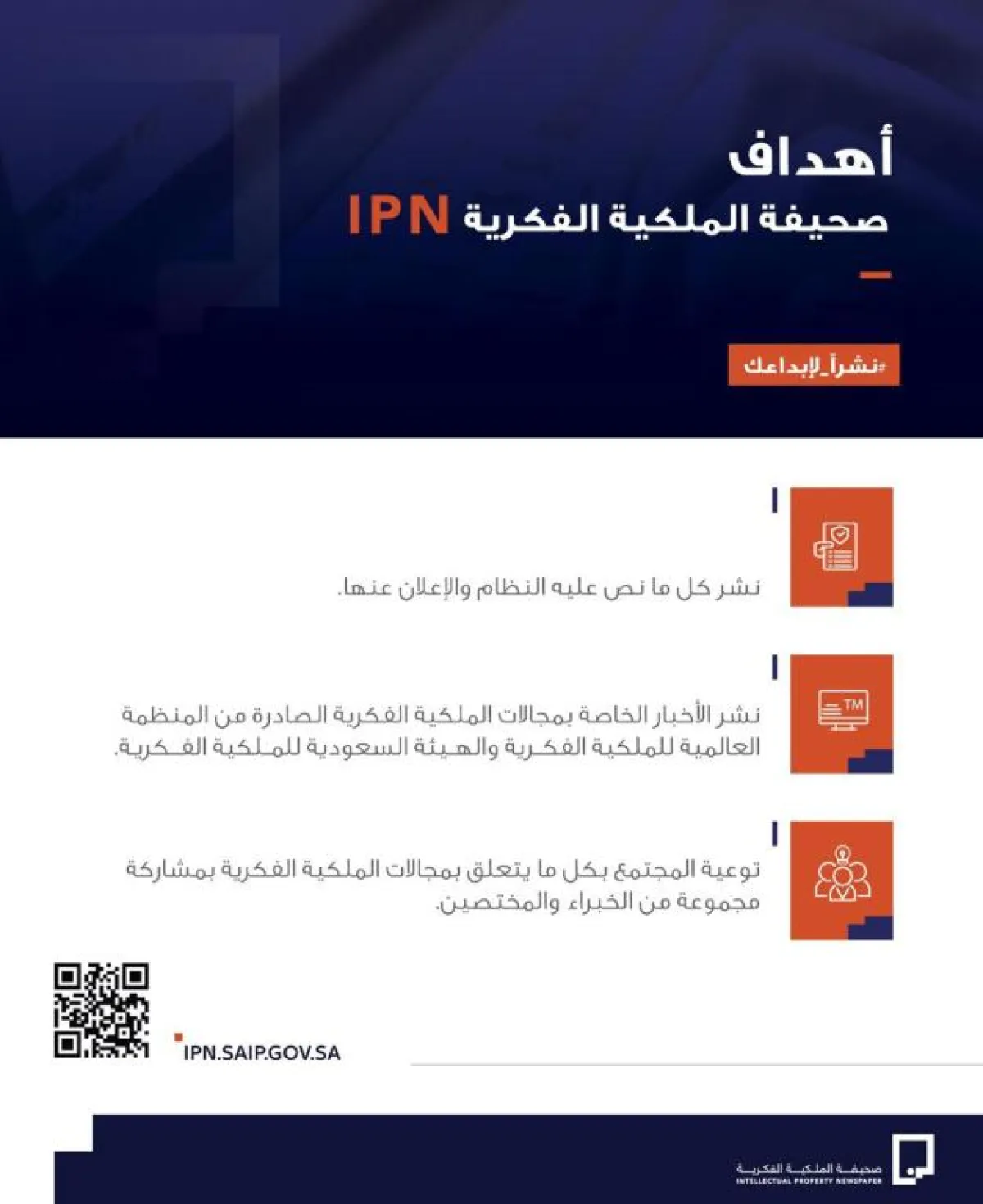 أعلنت الهيئة السعودية للملكية الفكرية عن إطلاق صحيفة الملكية الفكرية "IPN"، والتي تهدف من خلاله إلى نشر كل ما يتعلق بمجالات الملكية الفكرية وفق الأنظمة واللوائح الخاصة بها، يأتي ذلك بناء على المهام والاختصاصات الموكلة للهيئة والتي منها توفير المعلومات المتعلقة بحقوق الملكية الفكرية، وإتاحتها للجمهور. وأوضحت الملكية الفكرية أن الصحيفة ستكون خدمة جديدة ضمن سلسلة الخدمات التي تقدمها الهيئة للمستفيدين بهدف تحقيق الرضا وتعزيز جودة الخدمات المقدمة وستقوم من خلالها بنشر كل ما تم النص عليه في النظام بالنشر والإعلان لمجالات الملكية الفكرية ونشر الأخبار الخاصة بالعلامات التجارية وحق المؤلف وبراءات الاختراع الصادرة من المنظمة العالمية للملكية الفكرية والهيئة السعودية للملكية الفكرية بالإضافة إلى تقديم مواد الإرشاد والتوعية بمشاركة مجموعة من الخبراء والمسؤولين. وتدعو الملكية الفكرية الراغبين في الاستفادة من خدمات صحيفة الملكية الفكرية IPN ومعرفة المزيد من التفاصيل حولها إلى زيارة الموقع الإلكتروني الرسمي للصحيفة وذلك عبر الرابط IPN.saip.gov.sa