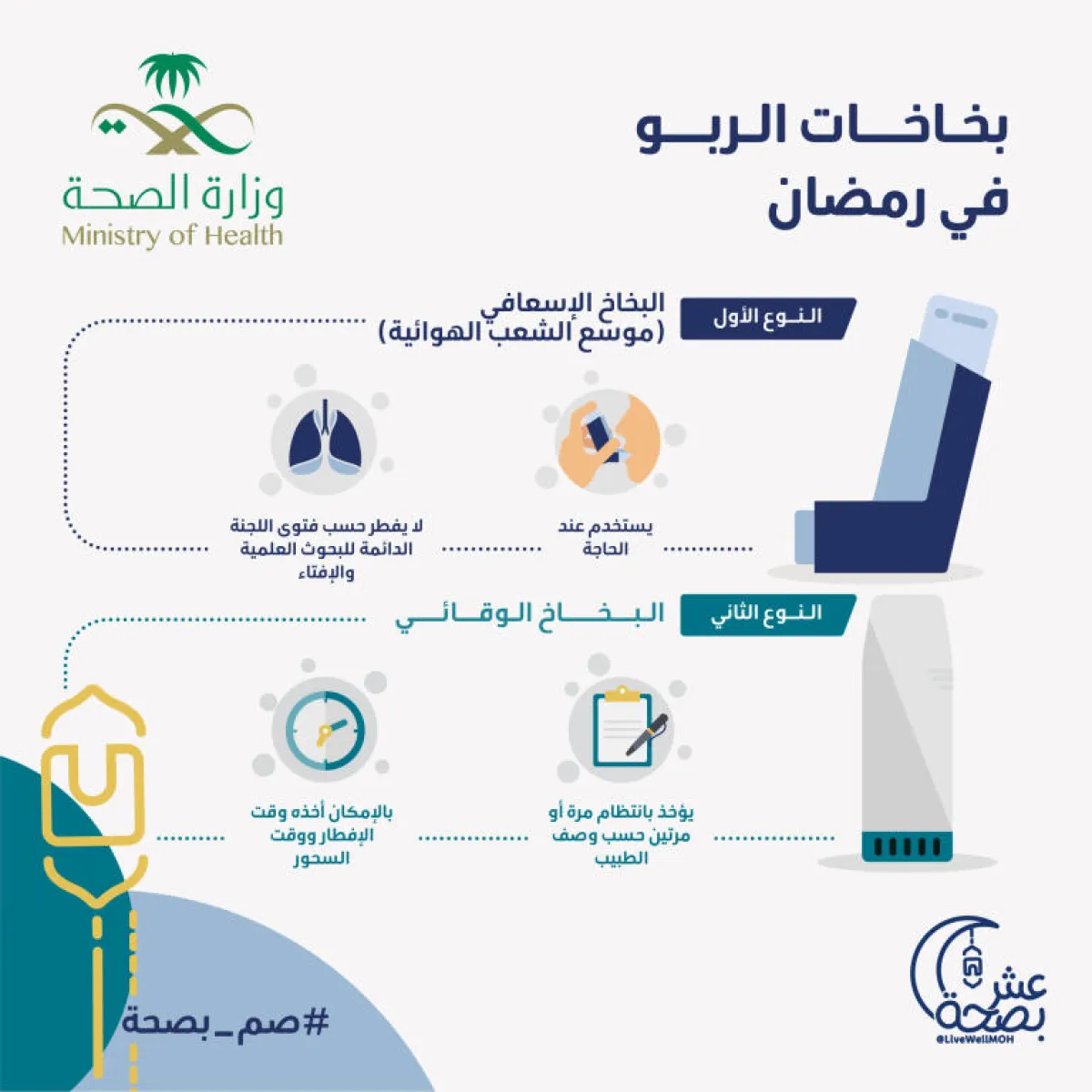 وقالت وزارة الصحة، عبر حسابها "عش بصحة"، على موقع "تويتر"، إن "بخاخات الربو" نوعين، الأول منها (بخاخ إسعافي) موسع للشعب الهوائية، ويُستخدم عند الحاجة، ولا يُفطر بحسب فتوى اللجنة الدائمة للبحوث العلمية والإفتاء.
