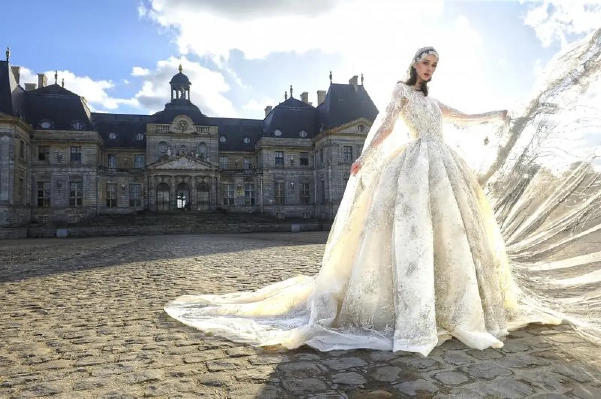 إذا كنت تبحثين عن إطلالة تشبه إطلالة الملكة في ليلة زفافك، فسوف تجدين مبتغاك في مجموعات ربيع وصيف 2021، حيث أن بعض الدور ارتأت أن تقدّم فستان الزفاف بقصّة فخمة وفاخرة. وقد رأينا هذه التصاميم في عرض إيلي صعب الذي قدّم فستاناً مطرّزاً بالكامل ومرفقاً بإكسسوار شعر من الريش الناعم، كما قدّم ستيفان رولان Stephane Rolland فستاناً مطرّزاً بقصّة ملكية جذابة.
