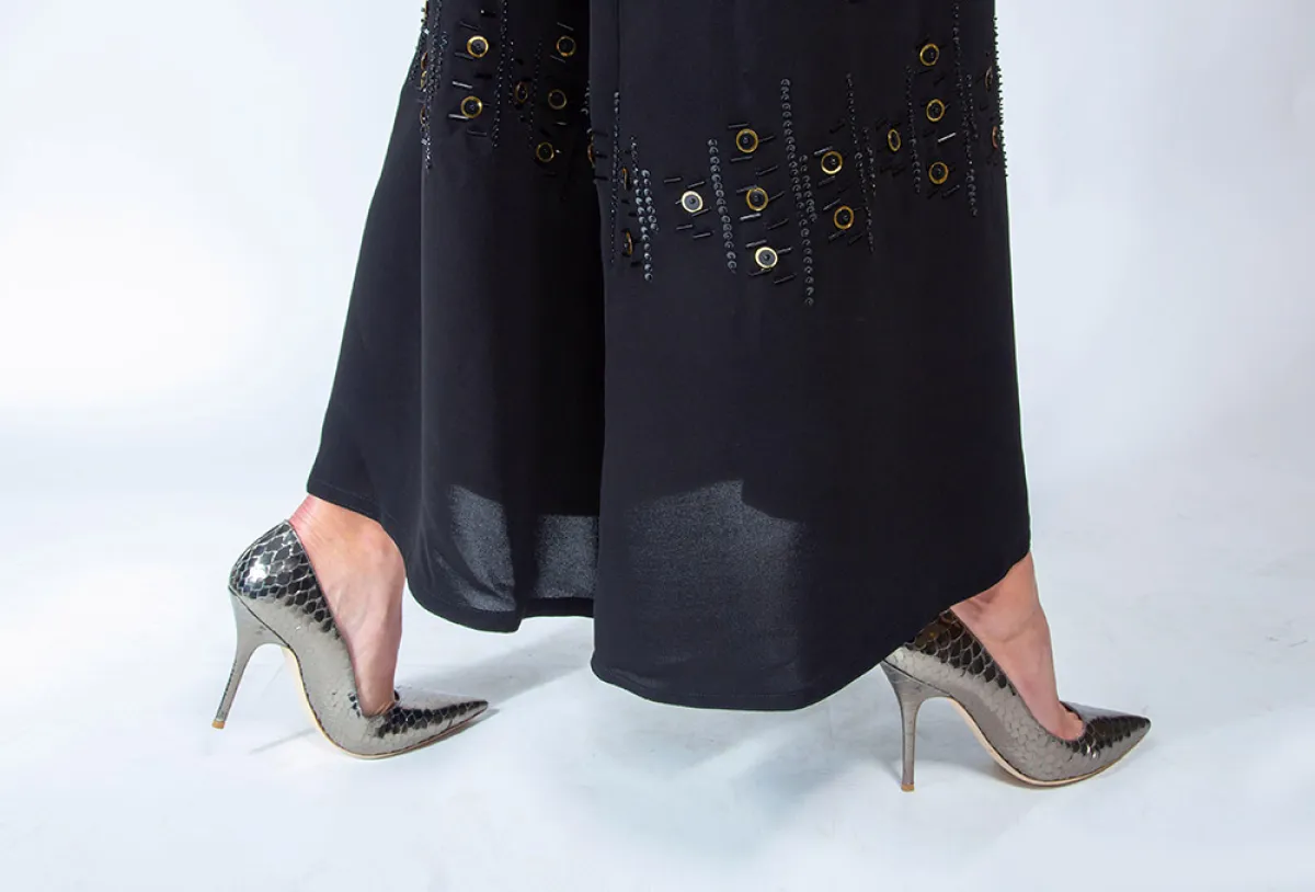 في حال كانت العباية تحتوي على تطريزات أو زخارف، فمن المهم البحث عن أحذية بسيطة مثل الألوان الأحادية أو الصنادل الصيفية، وعلى العكس إذا كانت بسيطة؛ فارتدي معها أحذية برّاقة مثل الأحذية الفضّية أو المطرّزة.