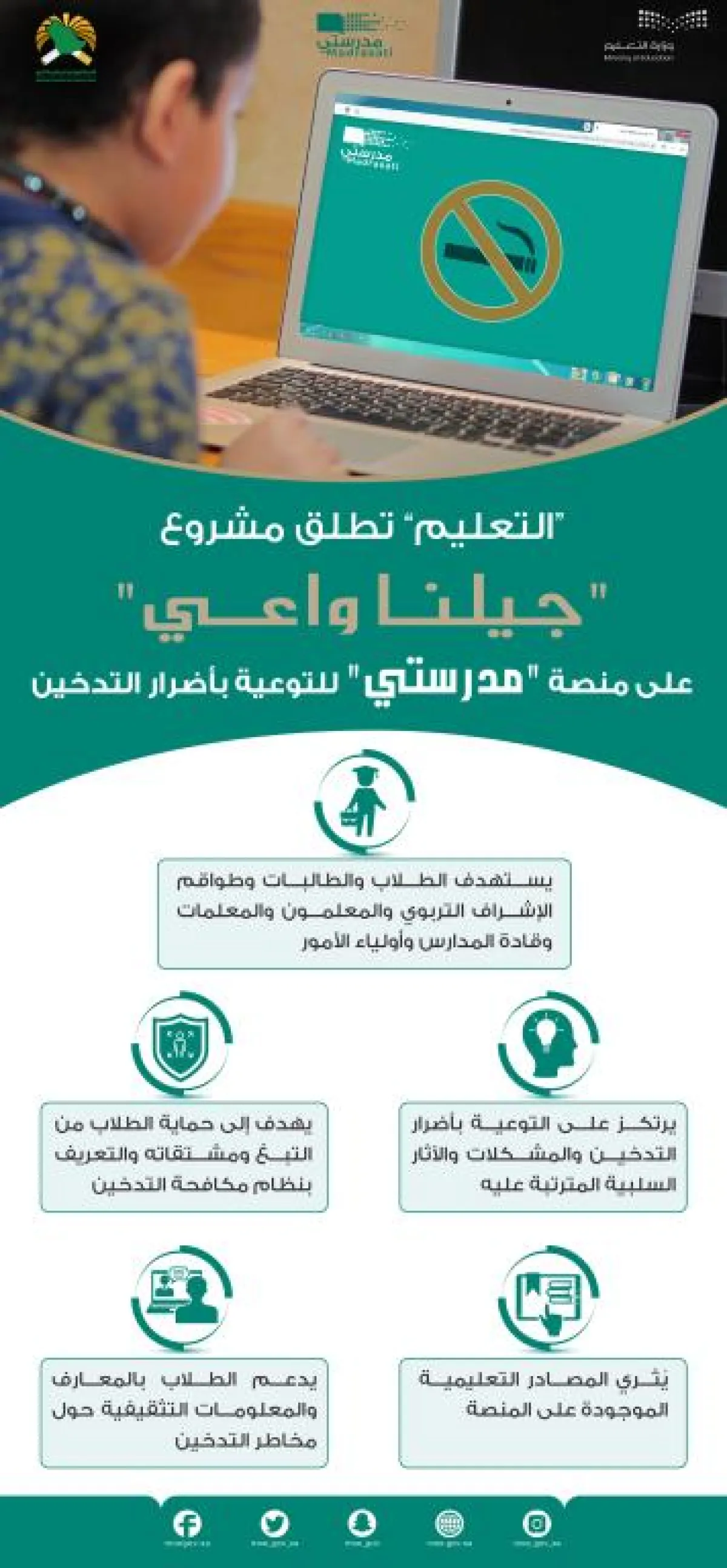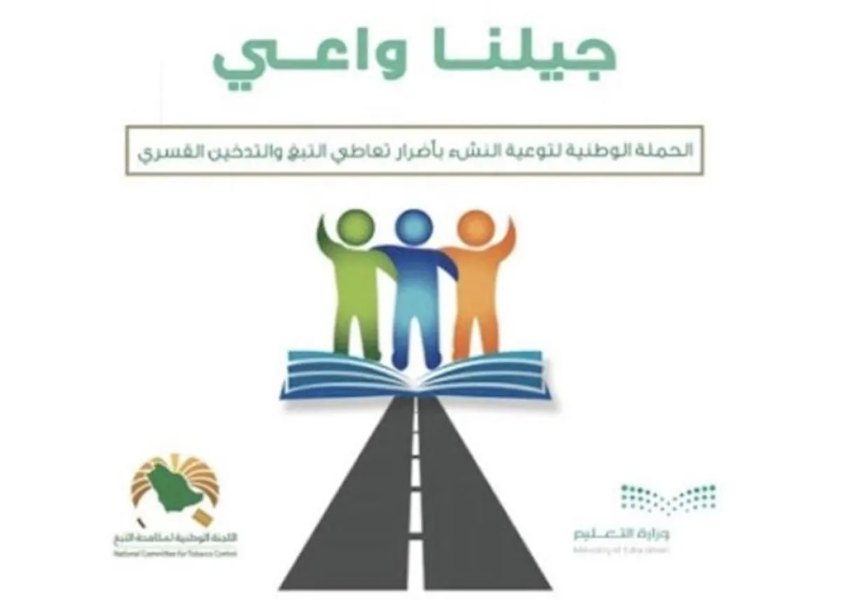تواصل وزارة التعليم العمل على مشروع "جيلنا واعي" من خلال منصة "مدرستي، للتوعية بالتدخين وأضراره والمشكلات والآثار السلبية المترتبة عليه، وإشراك الطلاب والطالبات وطواقم الإشراف والتدريس وأولياء الأمور في التفاعل مع المشروع، والتقيّد بنظام مكافحة التدخين؛ حرصًا على سلامة الجميع، وذلك بالشراكة بين وزارة التعليم واللجنة الوطنية لمكافحة التبغ.