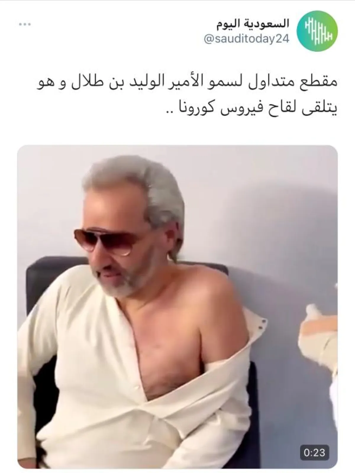 ونشرت الممرضة شريفة (أخصائية مختبرات طبية- مدربة إسعافات أولية) عبر حسابها على تويتر فيديو الوليد بن طلال وكتبت مغردة: شرفت بإعطاء الأمير الوليد بن طلال جرعته من لقاح كورونا .. جعلها الله له حصناً وعافية.