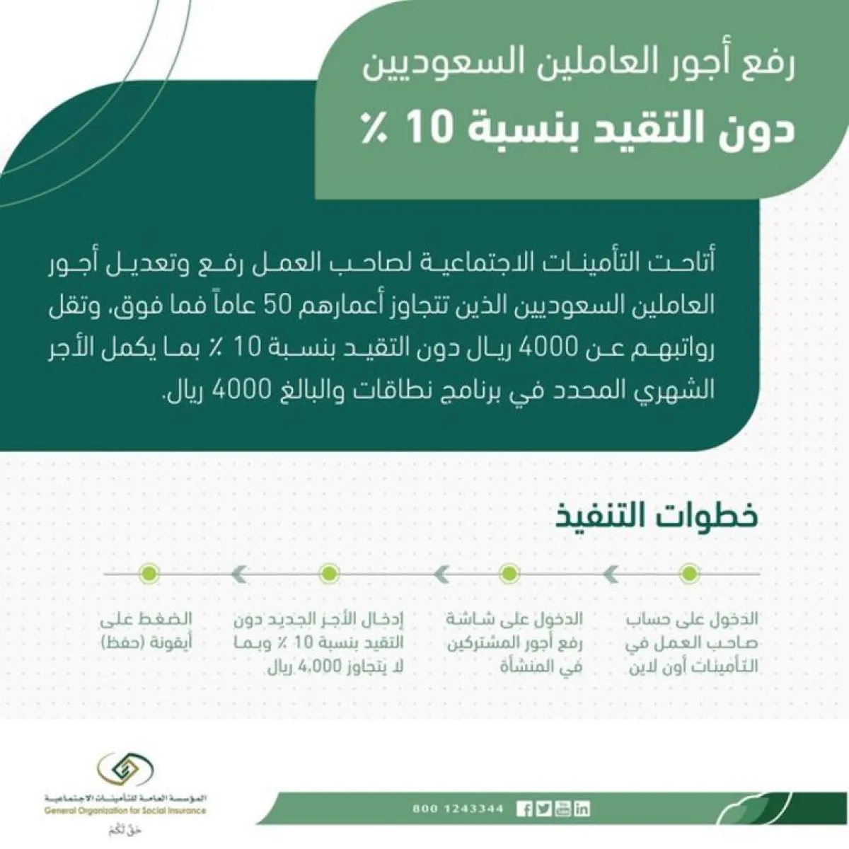 جدير بالذكر أن المؤسسة العامة للتأمينات الاجتماعية كانت قد أتاحت مؤخراً لصاحب العمل رفع وتعديل أجور العاملين السعوديين الذين تتجاوز أعمارهم الـ 50 عاماً وتقل رواتبهم عن 4000 ريال دون التقيد بنسبة 10% بما يكفل الأجر الشهري المحدد في برنامج نطاقات والبالغ 4000 ريال