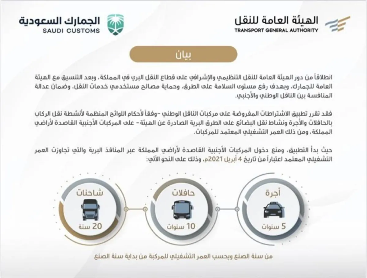 وكشفت أنه سيتم تطبيق اشتراطات المركبات الأجنبية على النحو التالي: سيارات الأجرة 5 سنوات، الحفلات 10 سنوات، الشاحنات 20 سنة من سنة الصنع، ويحسب العمر التشغيلي للمركبة من بداية سنة الصنع.