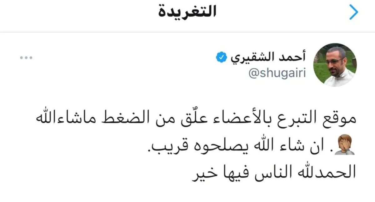 حدوث عطل على موقع التبرع بالأعضاء الإلكتروني بعد حلقة أحمد الشقيري، وقد أعلن الإعلامي أحمد الشقيري، أمس الاثنين عن وجود ضغط هائل على موقع التبرع بالأعضاء في السعودية، أدى إلى تعطيل الموقع الإلكتروني، وجاء ذلك تفاعلًا من المشاهدين بعد حلقته السابعة من برنامج "سين”.