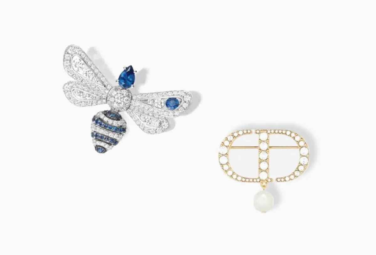 وقدمت ماركة ديور Dior هذا التصميم الجذاب، لبروش مُصمم من المعدن المطلي بالذهب الأصفر، ومُرصع بالكريستال الأبيض اللامع، على شكل الحروف الأولى من شعار الماركة، مع لؤلؤة كبيرة بيضاء تتدلي بشكل راقٍ من البروش.
