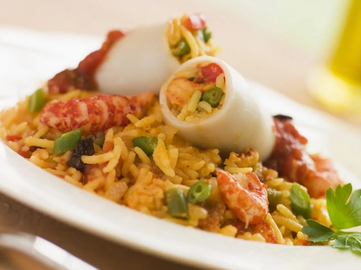 3- في طبق التقديم، يوزّع الأرز ومزيج البصل وحبّات البازيلاء المسلوقة، على أن يحمل السطح ثمار البحر.
