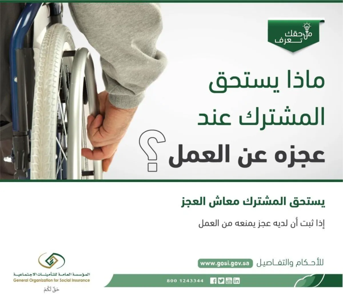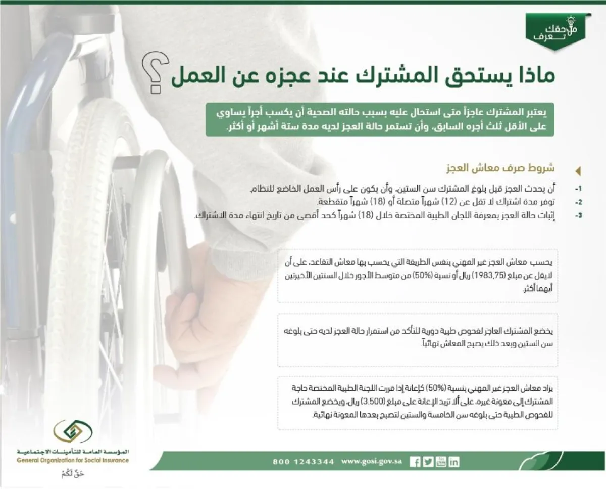 أوضحت المؤسسة العامة للتأمينات الاجتماعية ماذا يستحق المشترك عند عجزه عن العمل.