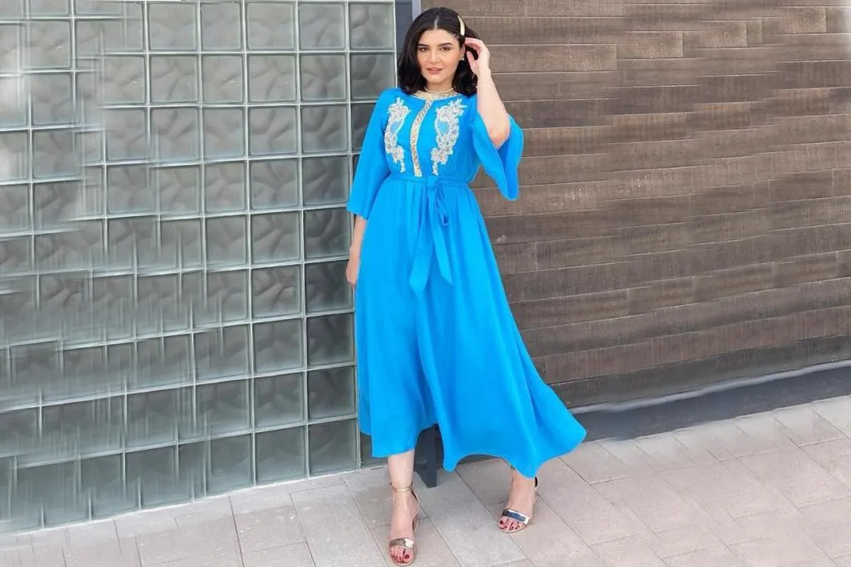 نورا محمد بفستان سماوي بتطريزات القفطان -الصورة من حسابها على الانستغرام
