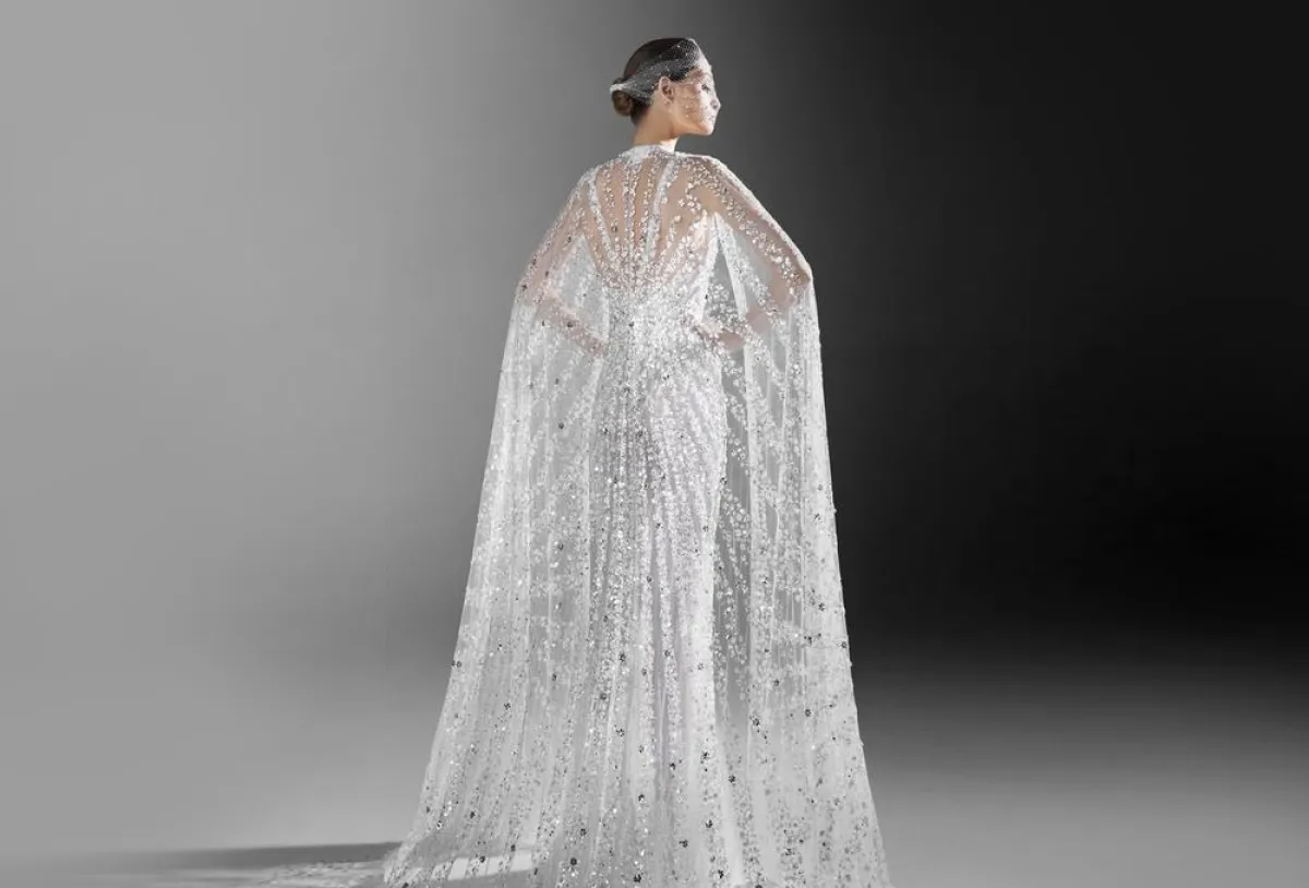 وشاح صغير زيّن فستان جورج حبيقة لعروس 2021 ، الوشاح بأكمام قصيرة وغطى تصميم الفستان عند الصدر. يمكن ارتداء هذا النوع من الفساتين خلال جلسة التصوير لإبراز جمال فستانك.