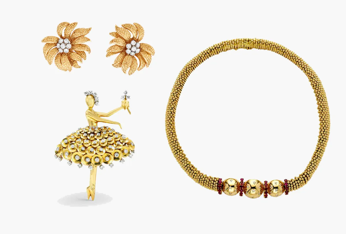أعلنت دوقة وندسور : "بعد الساعة الخامسة بعد الظهر، يجب ارتداء البلاتين فقط". غير أن قواعد المجتمع الراقي تلك باتت بالتلاشي تدريجيا ابتداءً خمسينيات القرن الماضي لتفسح المجال أمام فن حياة جديد يحبّذ الذهب على مدار الساعة. بينما كشفت مقاعد تشارلز إيمز السلكية الطبيعة الجوهرية لهيكلها واحتفل مصمم الديكور جيلبير بوالرات بالنحت بواسطة الإزميل والتشابك والزركشة بعدما استوحى من فن القرن السابع عشر والثامن عشر، كرّمت مجوهرات دار فان كليف أند آربلز Van Cleef & Arpels خيوط الذهب. أكانت ملتوية أم مضفرة أم منسوجة أم مخططة، بدت وكأنها تشكل أربطةً وحبال وأقمشة وتصاميم دانتيل. أقراص وترتر بألوان الذهب يتخللها الماس، تضفي الحياة إلى تنورة راقصة الباليه. خيوط ناعمة ودقيقة تلتقي لتشكل شبكة ذهبية تحمي مدقة متلألئة في قلب زهرة خيالية. كما تظهر الطبيعة بحيوتها والنباتات بأحجامها وحركاتها المختلفة في أوراق النبات العديد التي يبدو وكأنها رُسمت بحركة واحدة ثم تم نحتها.
