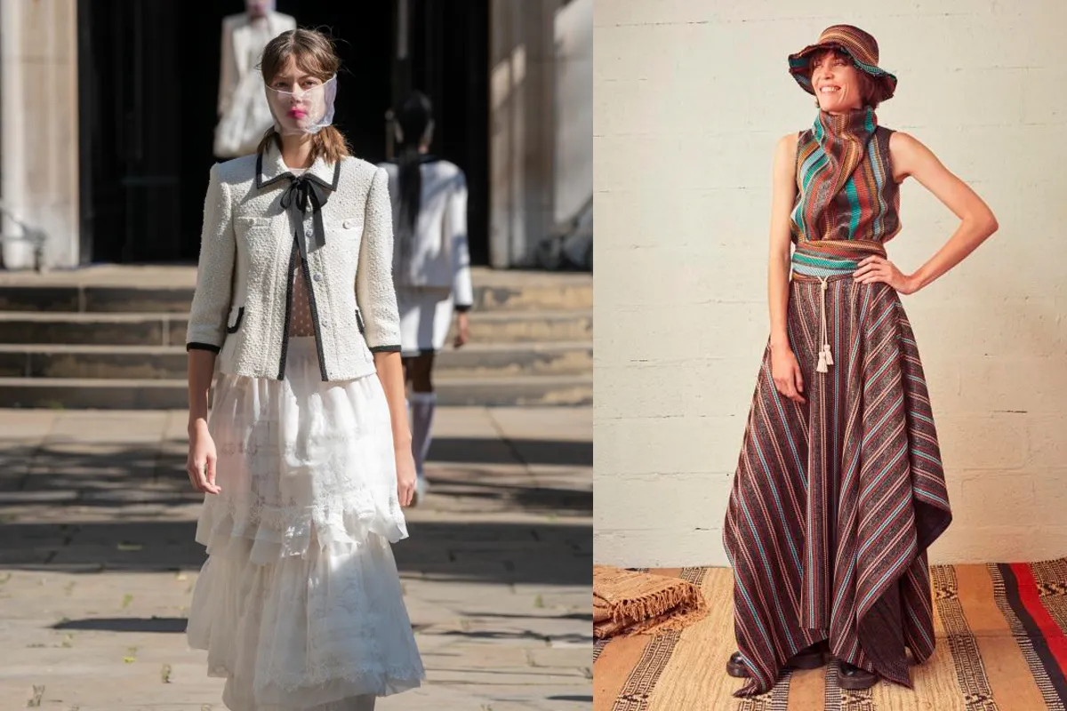 وقدمت ماركة Benjamin Benmoyal العديد من التصاميم الأنيقة للتنورة الطويلة المقلمة، أعجبنا منها هذا التصميم لتنورة مقلمة بتصميم A line، باللون البني، جاءت بخطوط رفيعة باللون البيج والأزرق الفاتح والأحمر، مع شقين جانيين جاءاً بتصميم الكشكش.