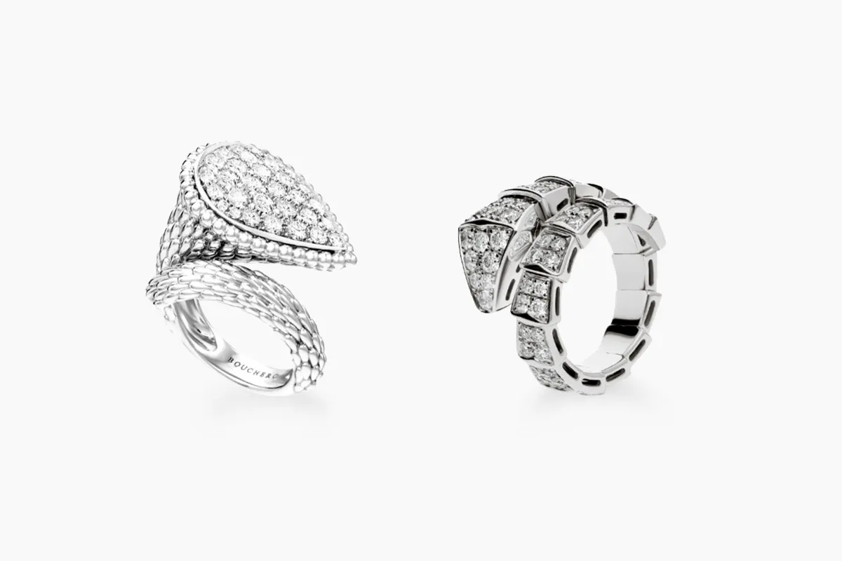 قدمت ماركة بولغري Bvlgari العديد من التصاميم الراقية والجذابة من مجوهرات الألماس، لتتناسب مع إطلالة أنيقة تناسب عيد الفطر، يُمكنكِ الاستعانة بهذا التصميم لخاتم من الألماس الأبيض من ماركة بولغري، يعود الثعبان المغري، الملتف حول تاريخ البشرية، إلى الأساطير اليونانية والرومانية القديمة. فكرة تمثل الحكمة والحيوية والإغواء. ابتكار ساحر من مجوهرات بولغري، تلتف هذه الجوهرة المتطورة والرائعة حول الإصبع لتضرب بجمال الموازين الثمين والالتواء المميز للثعبان.. المُصمم من الذهب الأبيض عيار ١٨ قيراطاً بوزن ١.٥٨ قيراط من حجر ألماس ويمكنك تنسيق هذا الخاتم الجذاب مع عباية بدرجات اللون الأحمر أو الأسود لتناسب إطلالة مسائية أنيقة.