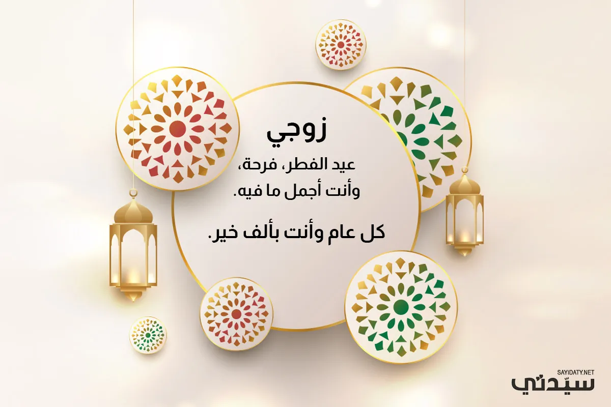 عيد فطر سعيد! في قلبي حطيتك وكالبدر اشوفك وفي العقل خليتك، حبي وزوجي سميتك وبعيد الفطر هنيتك. كل عيد فطر وأنت بخير وبقربي دائماً، لأن سعادتي في العيد لا تكتمل إلّا بوجودك.